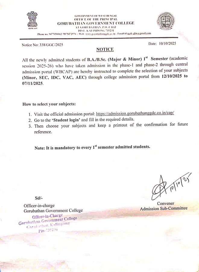 "Admission for the Academic Session 2025-26 and the List of Bangla Sahayta kendra of Gorubathan Block. For online application, visit:https://wbcap.in/"