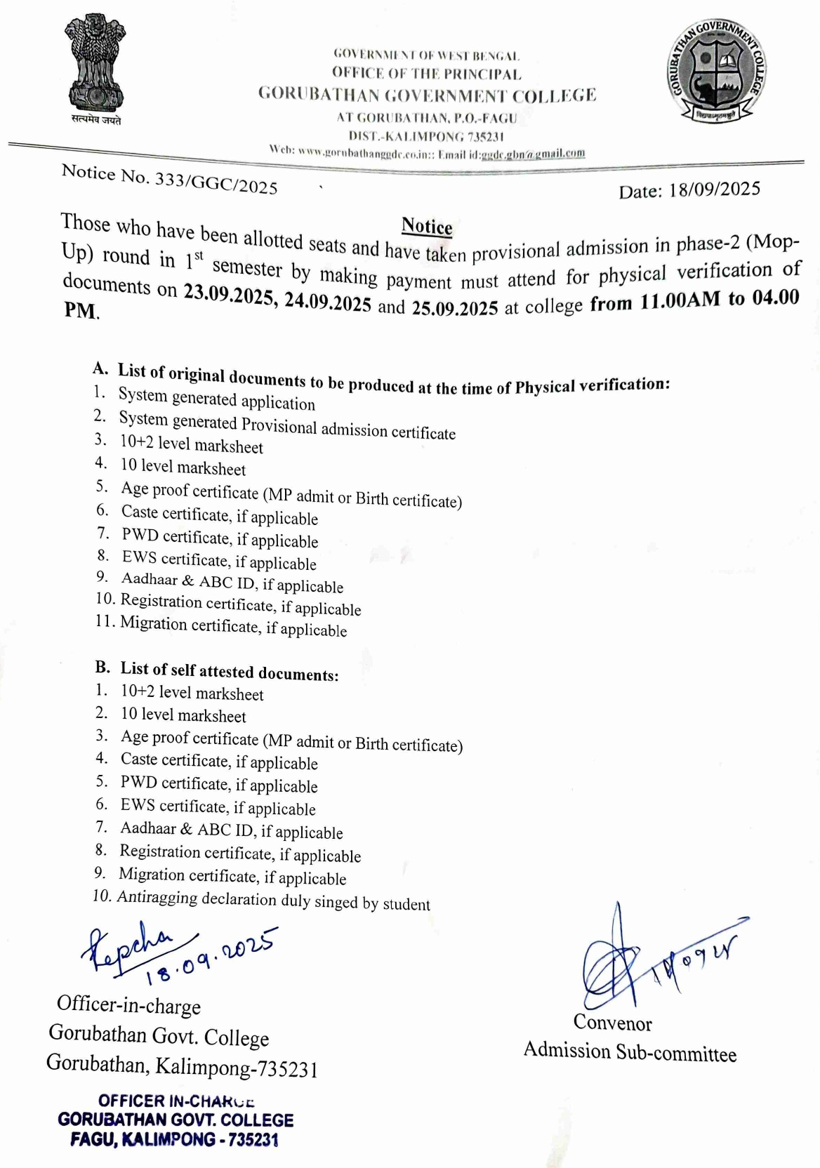 PHYSICAL VERIFICATION OF DOCUMENTS ON 9TH AND 10TH OCTOBER, 2025 FOR 1ST SEMESTER ADMITTED STUDENTS IN THE PHASE-2 (MOP-UP)